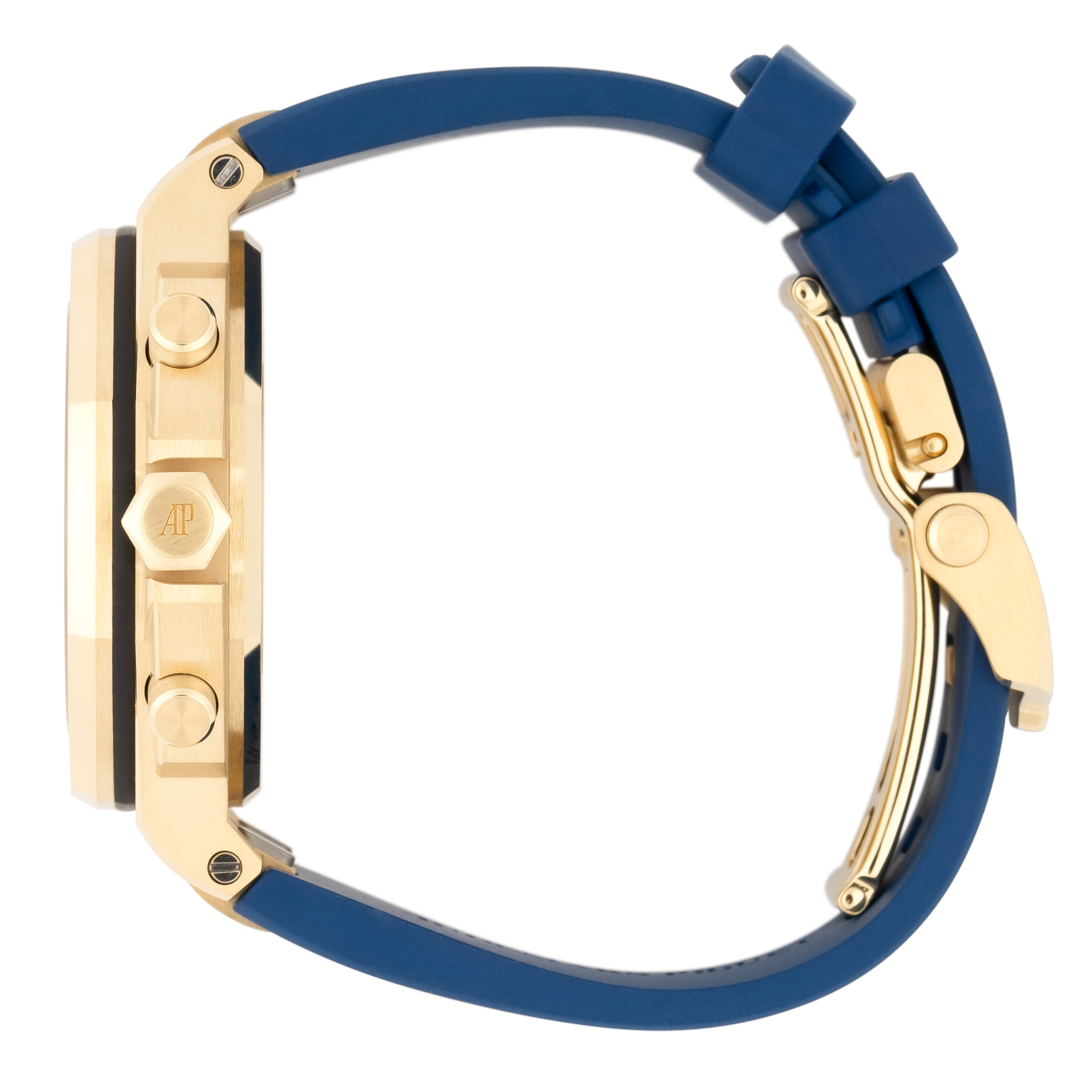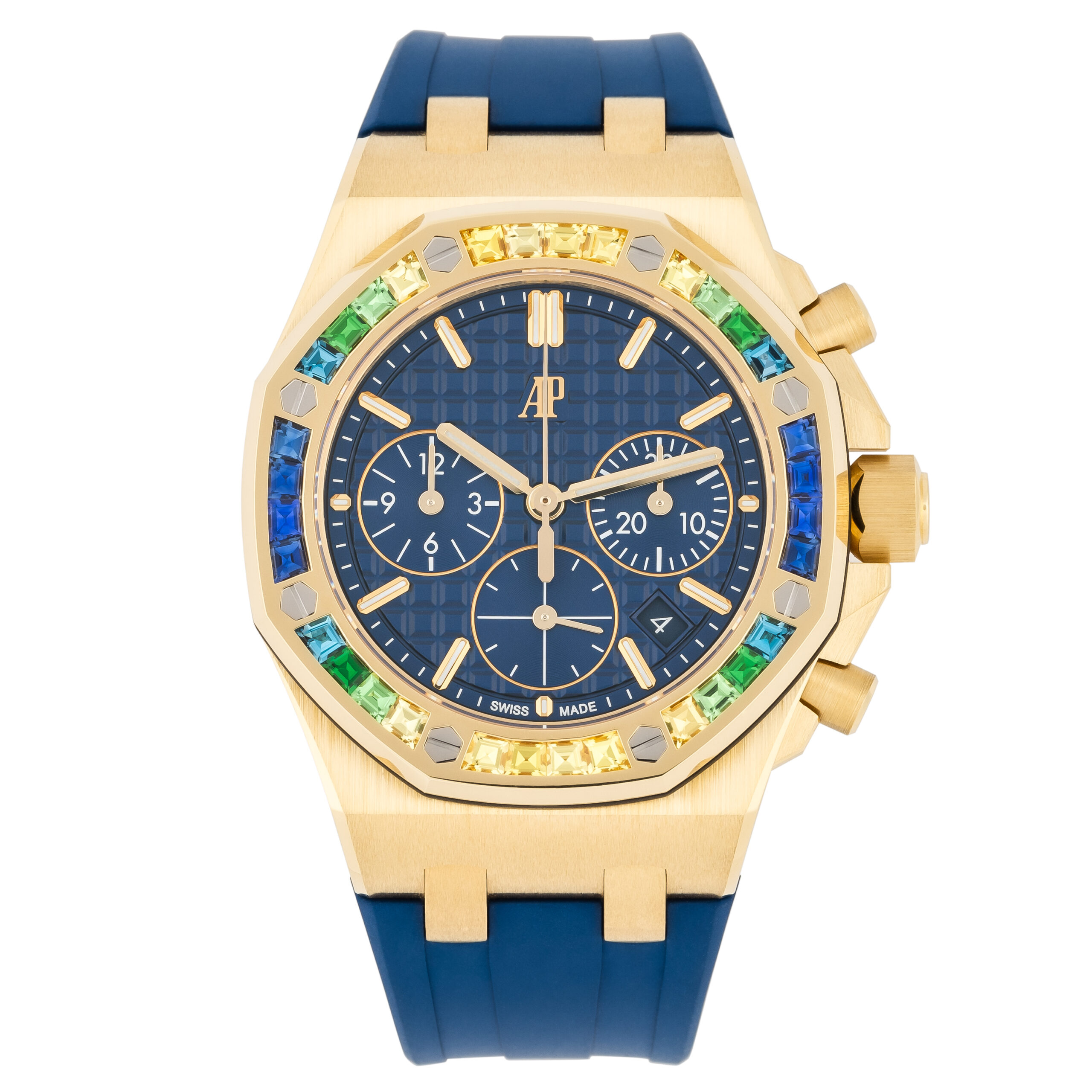 This extravagant Royal Oak Offshore Selfwinding Chronograph 26236BA.YY.D346CA.01 timepiece is designed in a 37mm 18k yellow gold case with 32 baguette-cut blue, yellow, and green sapphires highlighting the octagonal bezel. The blue dial features a ‘Lady Tapisserie’ pattern with yellow gold applied hour markers and luminescent Royal Oak hands. The embellished wristwatch is styled on a rubber blue strap.