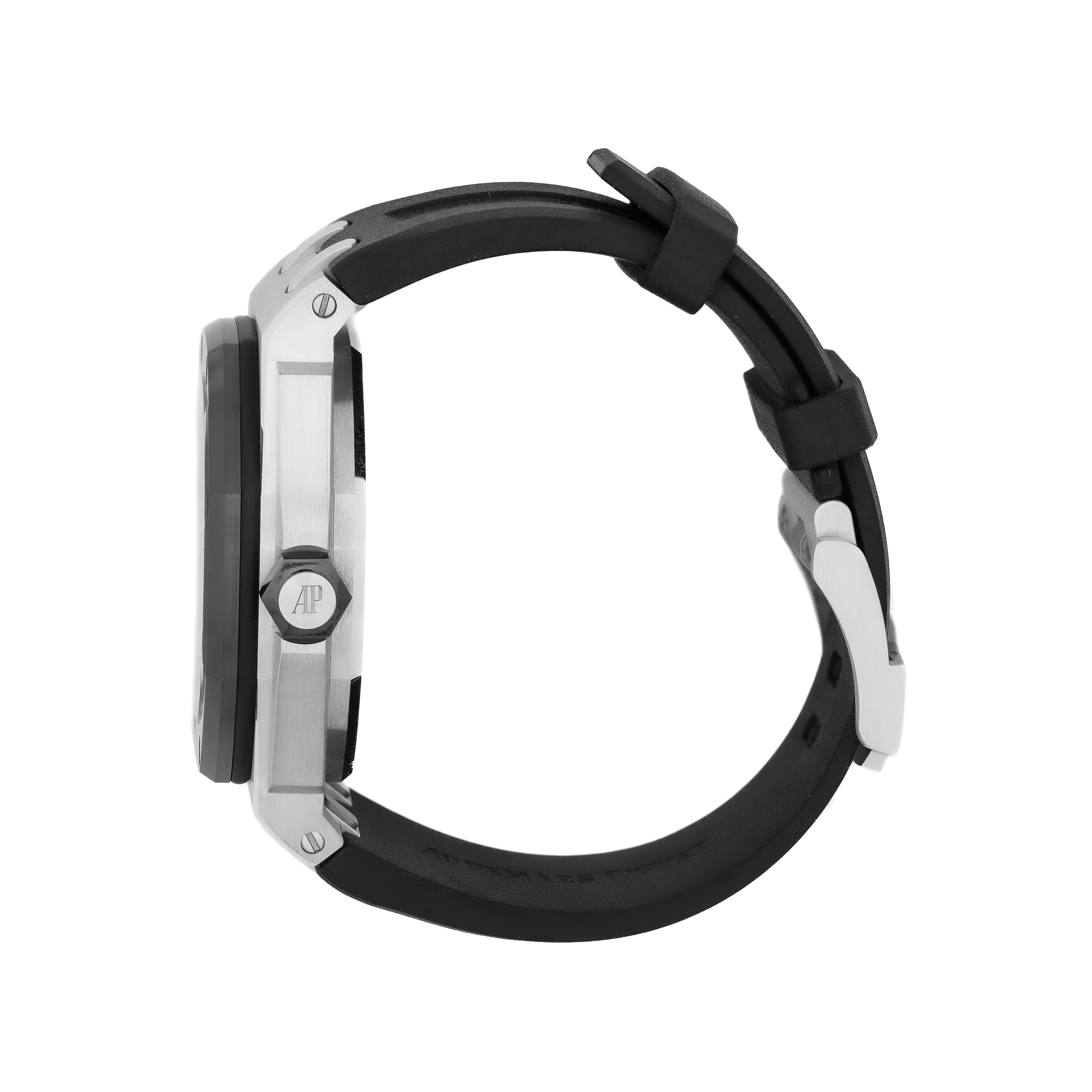 Black dial with pattern, white gold applied hour-markers and Royal Oak hands with luminescent coating, black rotating inner bezel with zone from 60 to 15 minutes in beige.