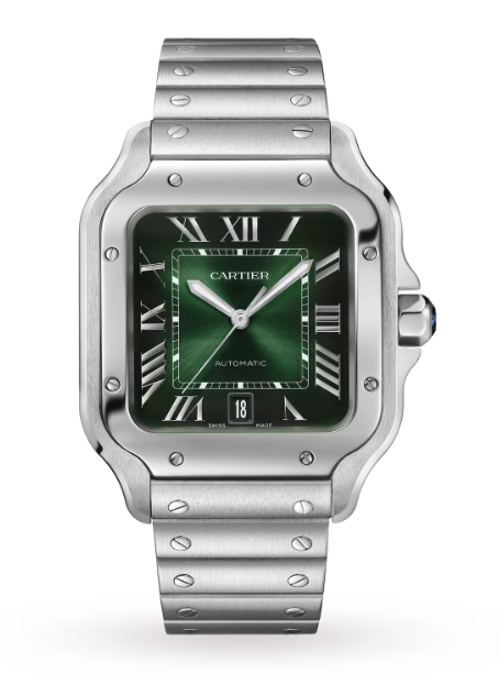 Santos de Cartier watch, large model, mechanical movement with automatic winding 1847 MC. Steel case, 7-sided crown set with a synthetic faceted blue spinel, graduated green dial, polished steel sword-shaped hands with luminescent material, sapphire crystal. Steel bracelet with SmartLink adjustment system. Second strap in green alligator skin, with interchangeable steel folding buckle. Both are fitted with the QuickSwitch interchangeable system. Case width: 39.8 mm, thickness: 9.38 mm. Water-resistant up to 10 bar (approx. 100 metres).