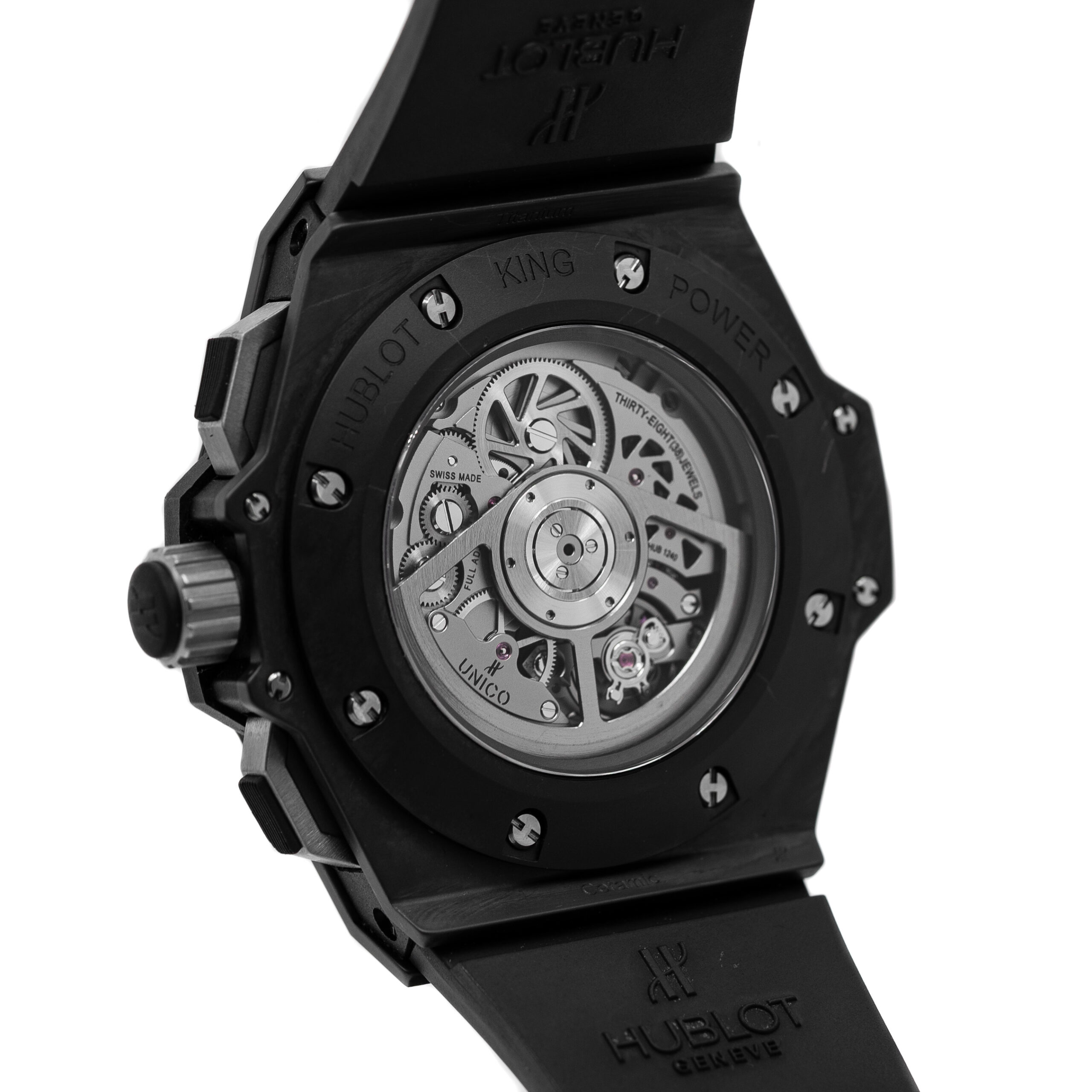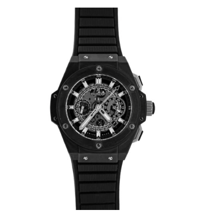 48mm microblasted black ceramic case, microblasted black ceramic and black rubber bezel with 6 H-shaped titanium screws, sapphire crystal, sapphire dial with satin-finished rhodium-plated appliques with white luminescent, satin-finished rhodium-plated han
