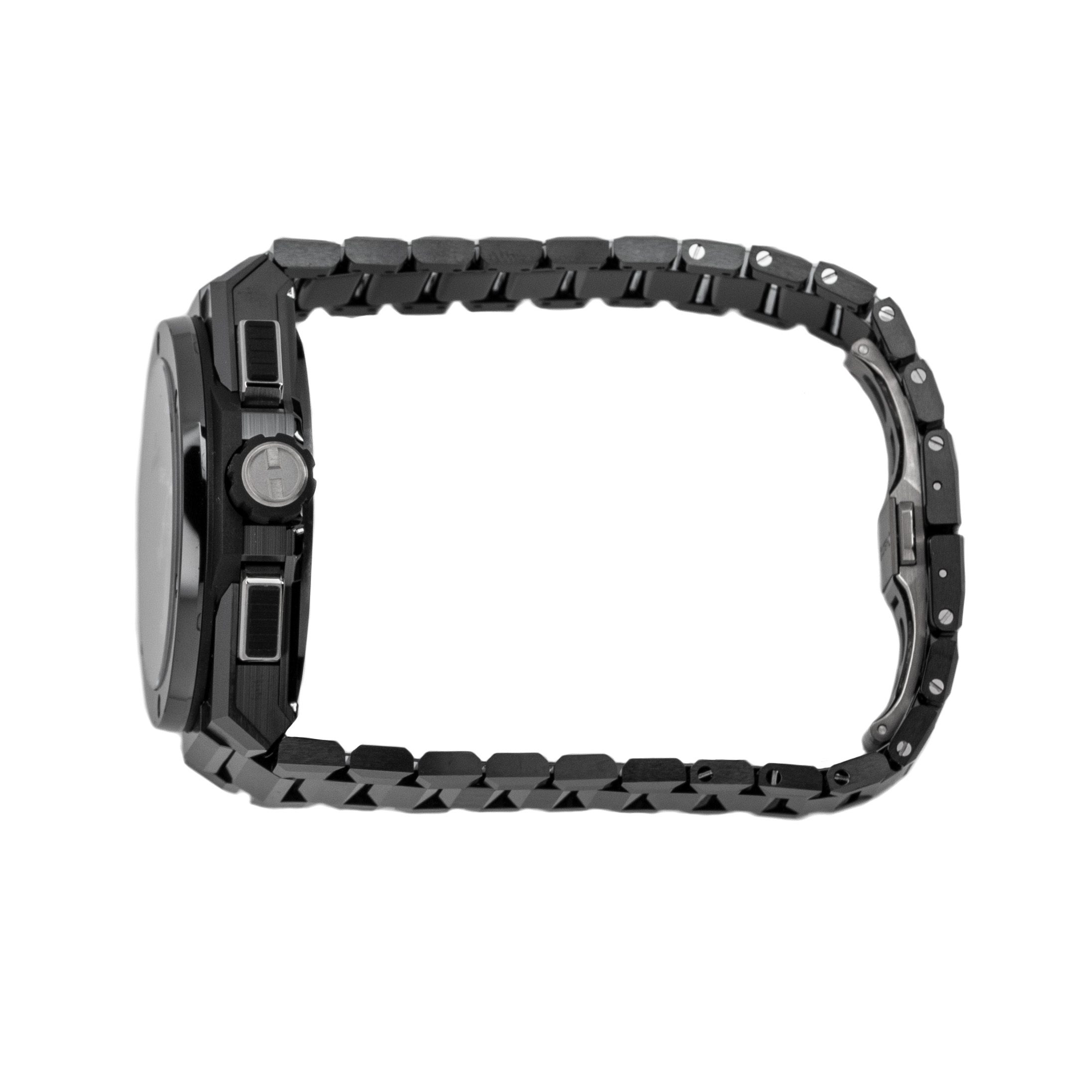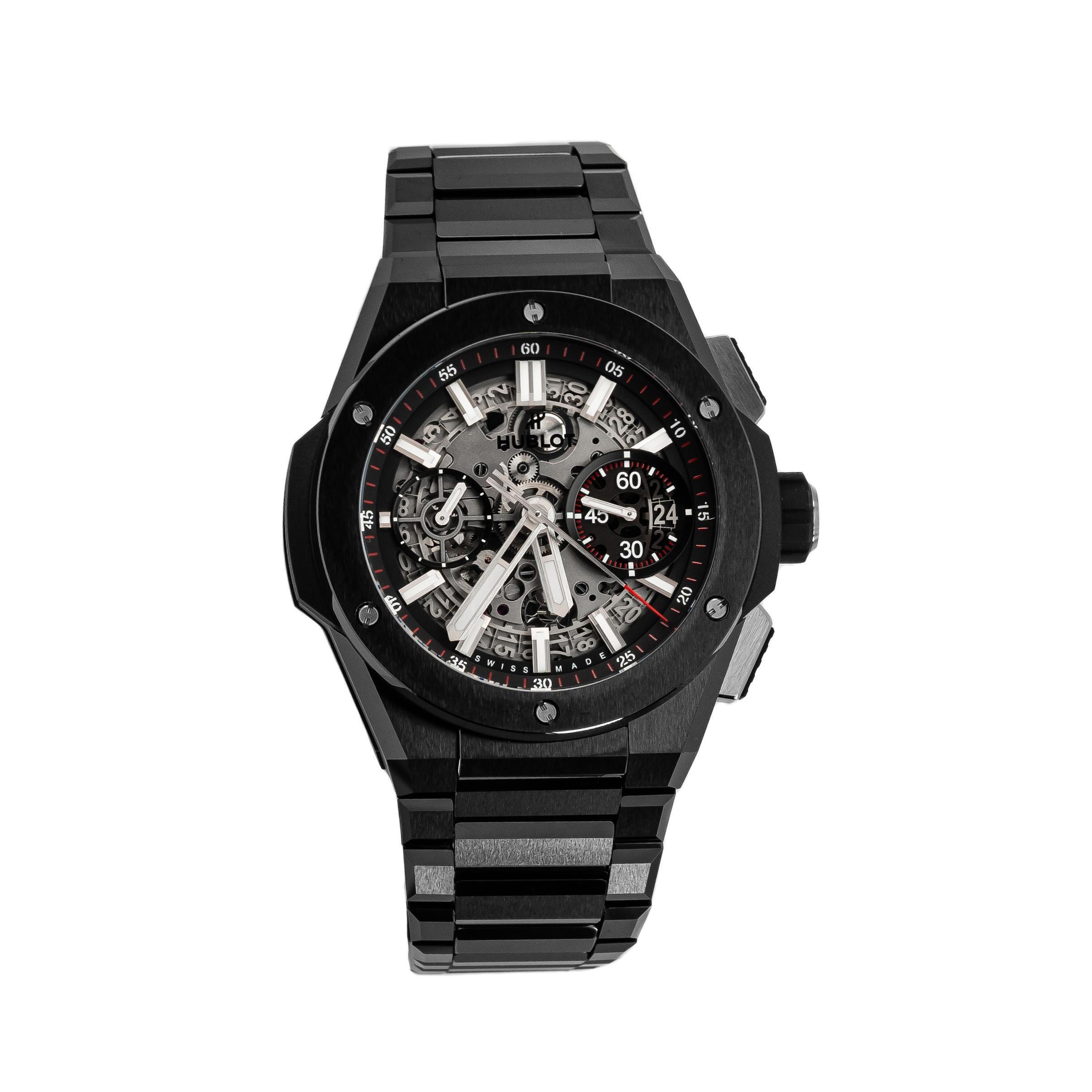 Black ceramic case with a black ceramic bracelet. Fixed black ceramic bezel. Skeleton dial with luminous silver-tone hands and index hour markers. Arabic numeral minute markers (at 5 minute intervals). Minute markers around the outer rim. Dial Type: Analo