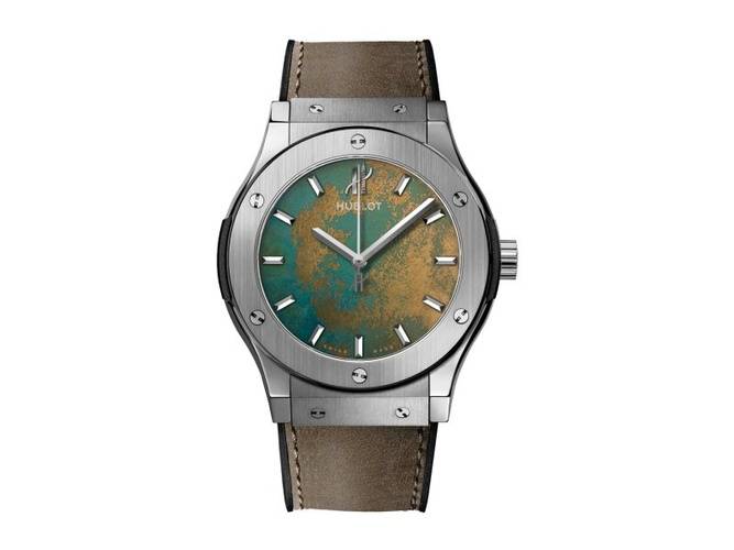 Silver-tone titanium case with a brown calfskin leather strap. Fixed bezel. Bronze dial with silver-tone hands and index hour markers. Dial Type: Analog. Hublot Calibre HUB1100 automatic movement with a 42-hour power reserve.