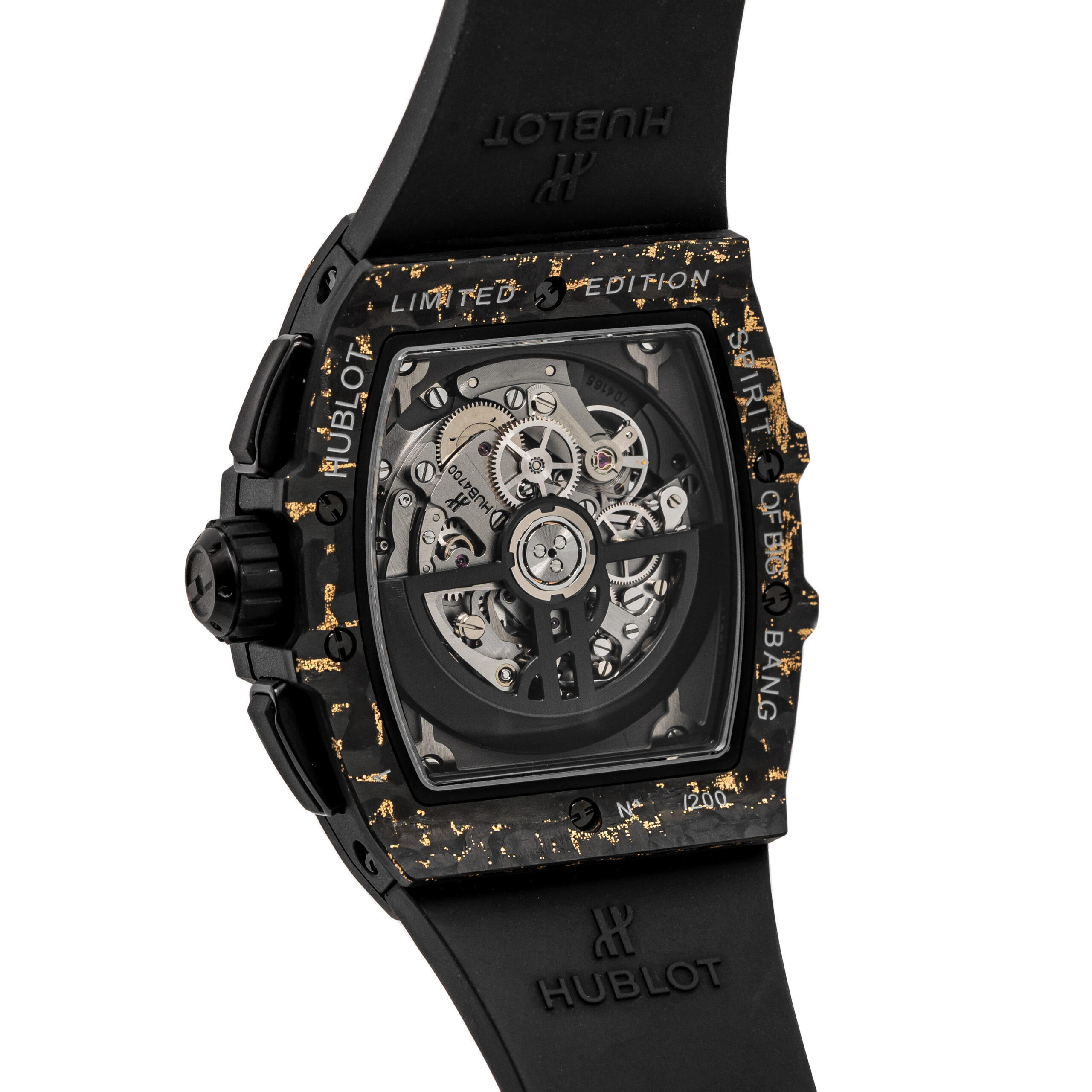 This unique, complex, beautiful material, developed by Hublot, fuses carbon fibre with gold to create a unique finish defined by its glimmering gold Inclusions. The watch is limited to 200 pieces and no two will be exactly the same. The patterns created b