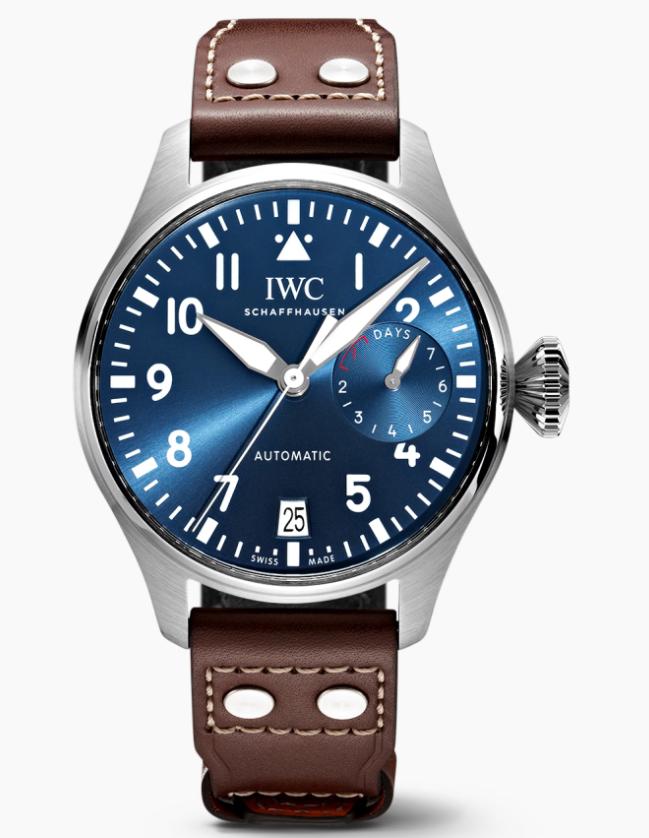 Stainless steel case with a brown (calfskin) leather strap. Fixed stainless steel bezel. Blue dial with luminous silver-tone hands and Arabic numeral hour markers. Minute markers around the outer rim. Dial Type: Analog. Luminescent hands. Date display at
