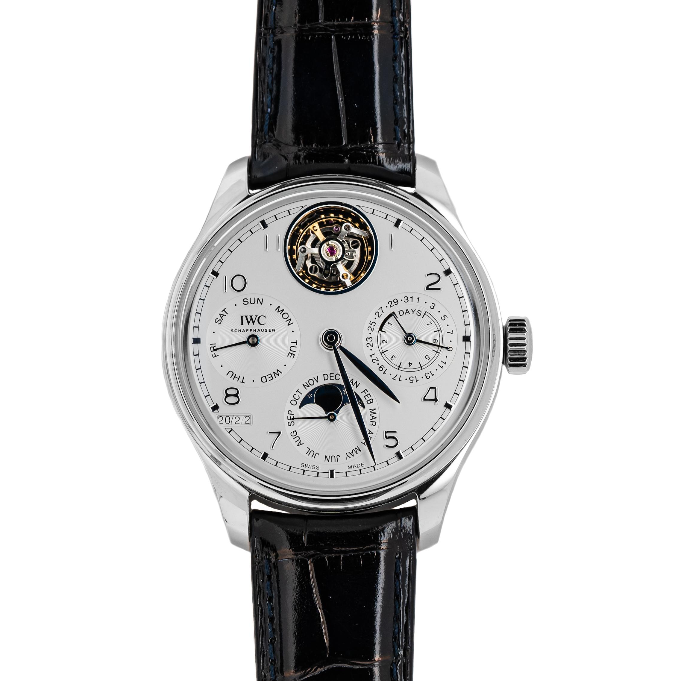 The IWC-manufactured 51950 calibre combines a perpetual calendar with a tourbillon that has 82 individual parts and weighs only 0.635 grams. To make it visible at 12 o’clock, the calendar module’s advance ring was opened, and the moon phase integrated int