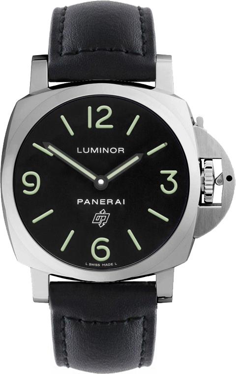 Polished Steel case with Black Calfskin Leather strap. Tang clasp. Fixed bezel. Dial description: Luminous hands and Arabic Numerals/Index hour markers on a black dial. Manual Winding movement. Powered by Panerai Calibre OP I engine with 56 hours power re