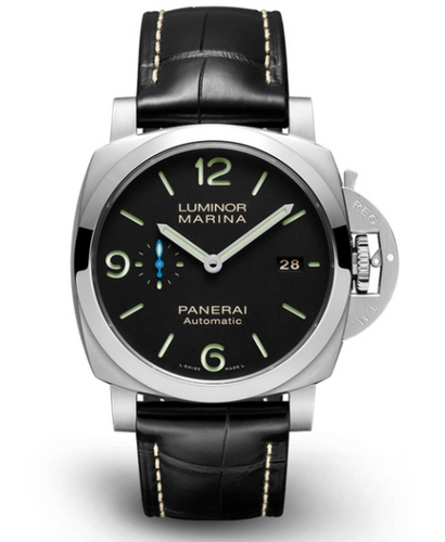 Silver-tone stainless steel case with a black (alligator) leather strap. Fixed silver-tone stainless steel bezel. Black dial with luminous silver-tone hands and index hour markers. Arabic numerals mark the 6, 9 and 12 o’clock positions. Dial Type: Analog.