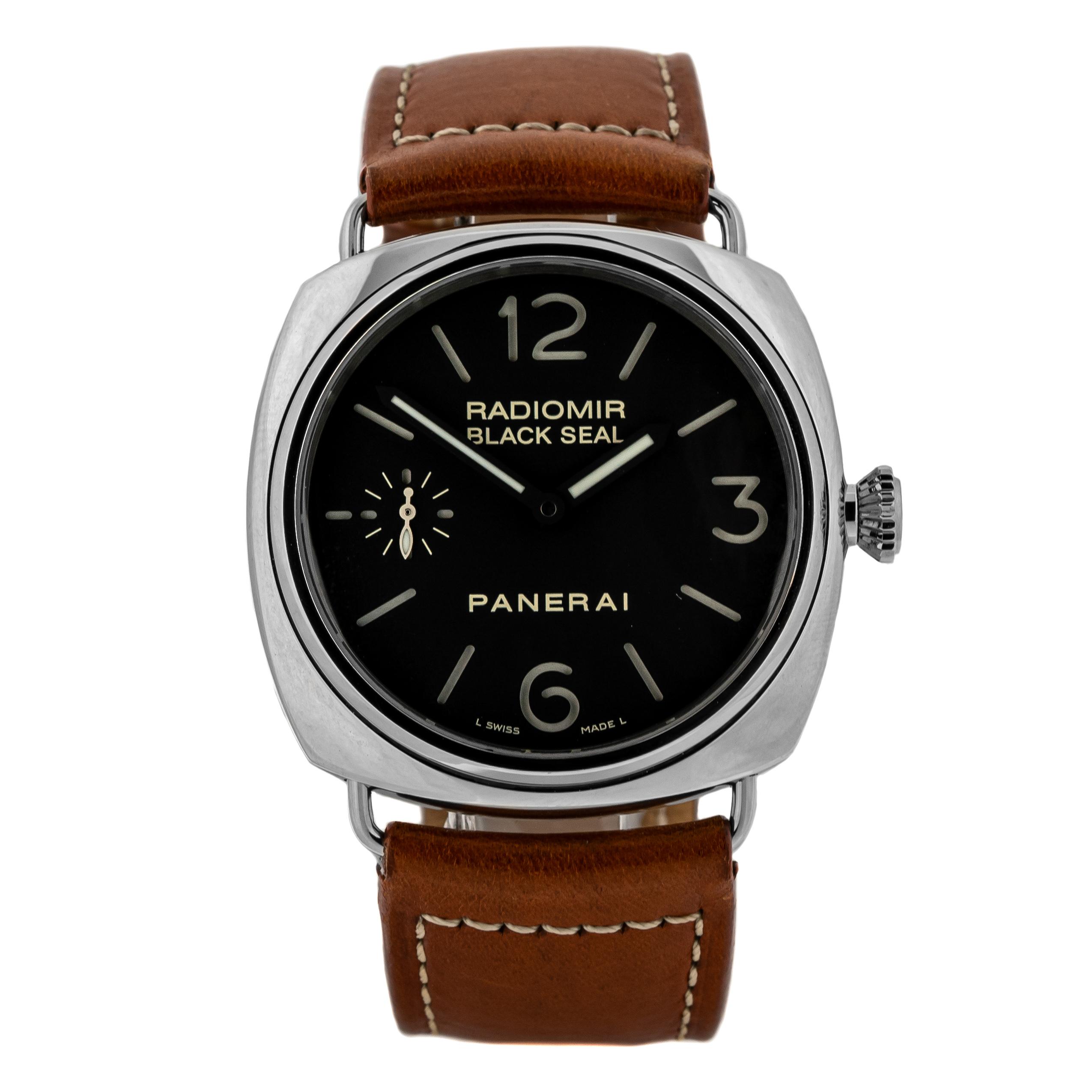 PAM 183, has a 45 mm Case with Crown and a Stainless Steel Bezel. This Men’s Panerai RADIOMIR has an attractive Black Dial with Dial Markers.