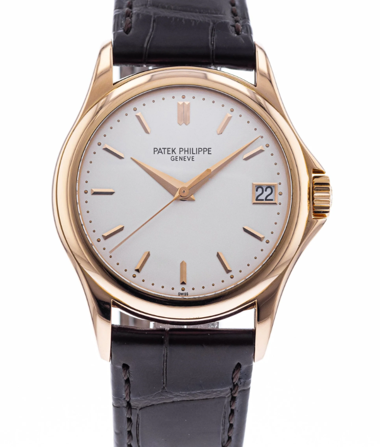 Patek Philippe Calatrava in 18k rose gold on brown alligator strap with PP 18k rose gold tang buckles. Auto w/ sweep seconds and date. 36.5 mm case size