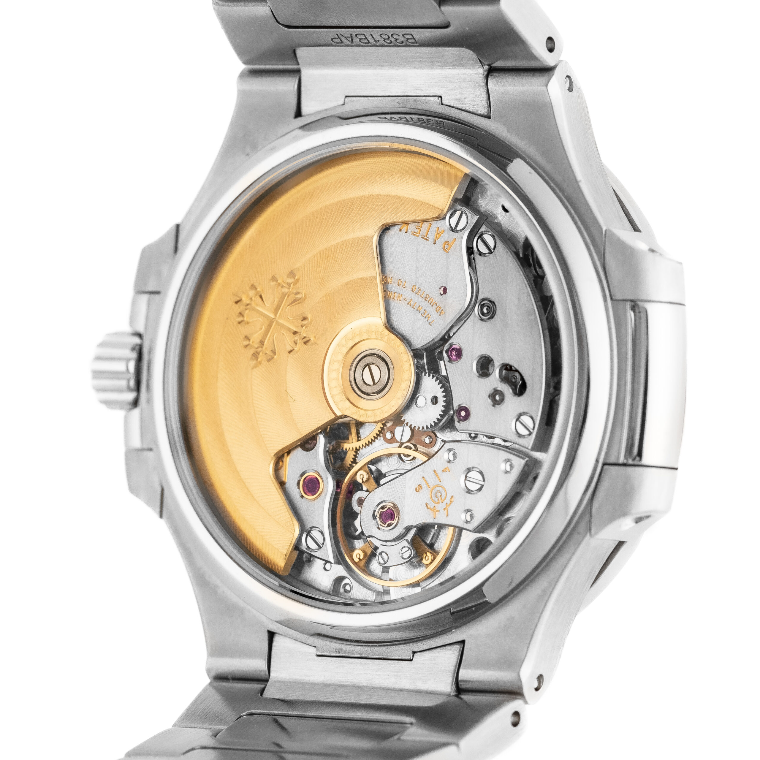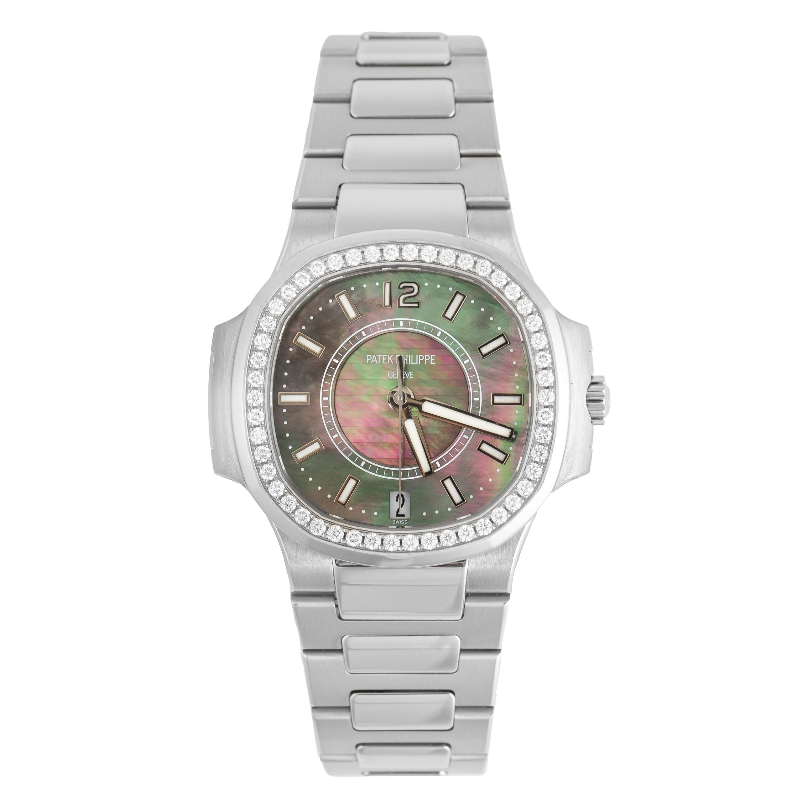 The water-resistant watch Patek Philippe Nautilus Lady 7008/1 7008/1A-010 is available in a round stainless steel case. The size is 33.6 mm with a water resistance of 60 m and a bezel of 50 white diamonds of 0.71 ct. Inside the case is an automatic moveme