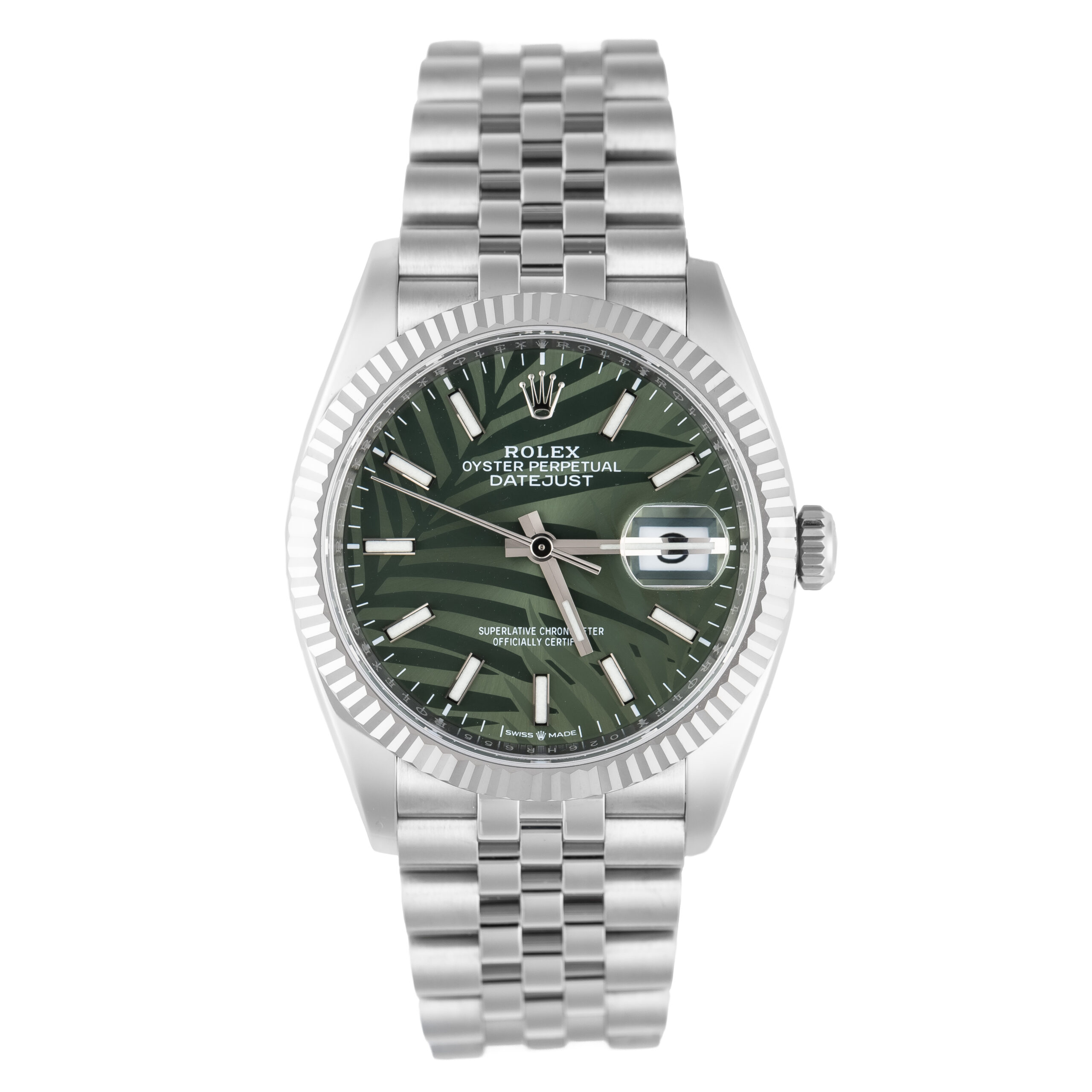 Olive Green Palm Motif Diamond Dial 36mm Jubilee Stainless Steel and 18K White Gold Watch