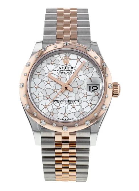 31mm Everose Rolesor case comprised of Oystersteel and Everose gold, screw-down back, screw-down crown with twinlock double waterproofness system, domed, diamond bezel, scratch-resistant sapphire crystal with cyclops lens over the date, silver floral motif dial set with 24 diamonds, Rolex calibre 2236 perpetual self-winding movement with centre hour, minute and seconds hands, instantaneous date with rapid setting, and stop-seconds for precise time setting, approximately 55 hours of power reserve, Oyster bracelet with flat three-piece links, folding Oysterclasp buckle with Easylink 5mm comfort extension link. Waterproof to 100 metres / 330 feet.