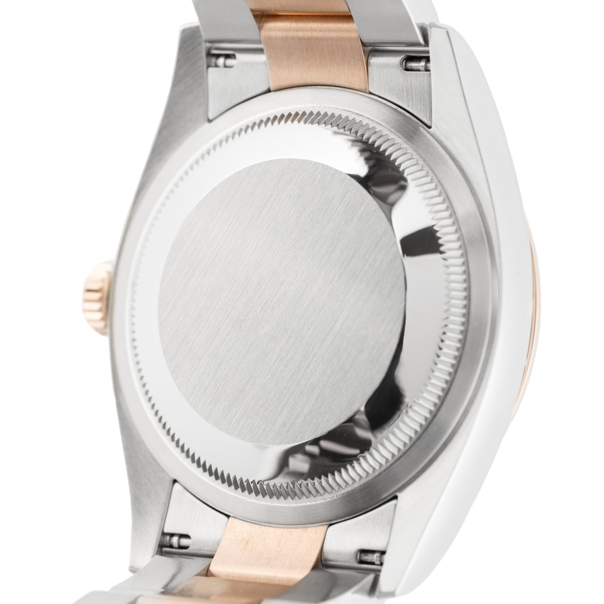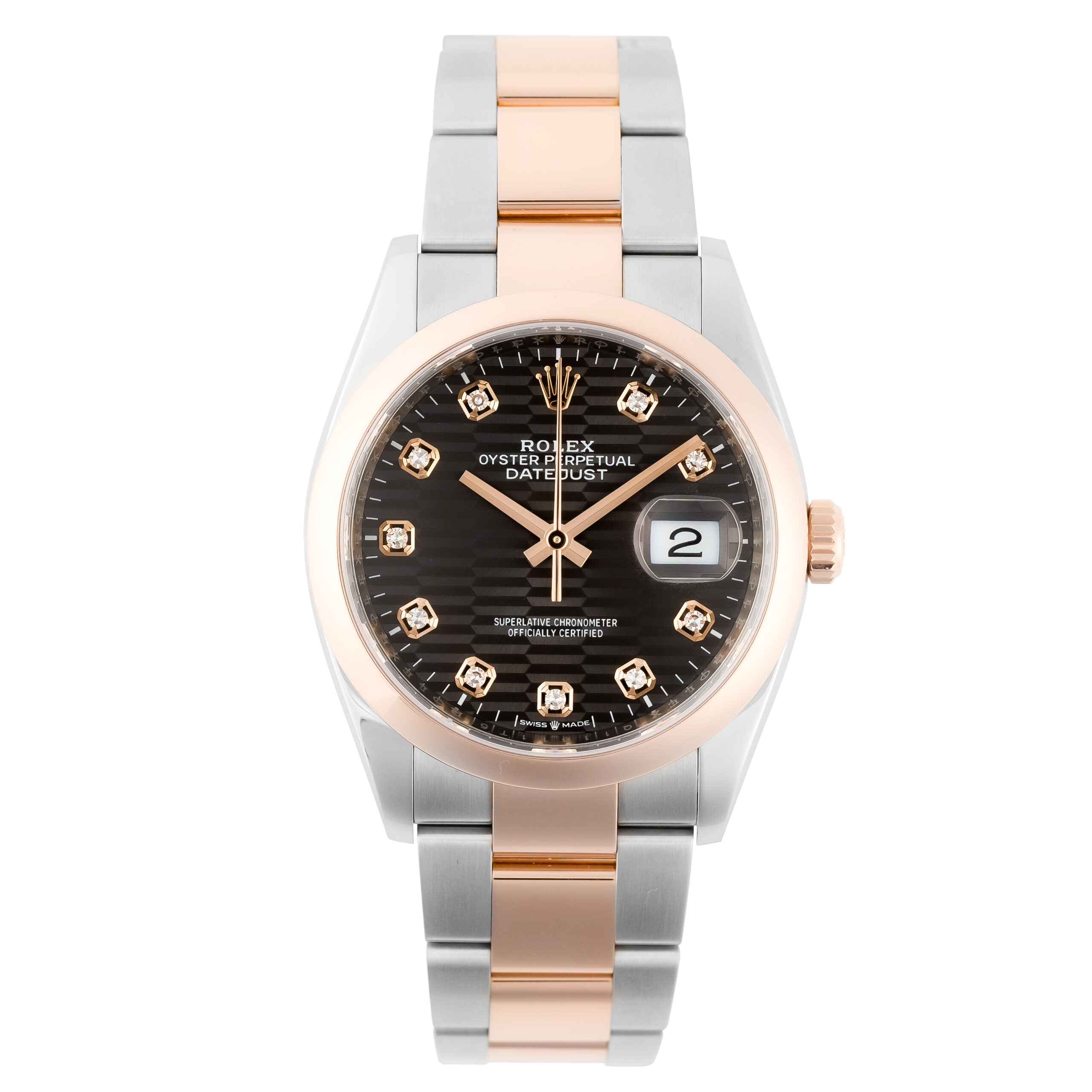 Steel/Rose Gold 36 mm Round Case with Screw Down Crown and a Rose Gold Domed. This Men’s Rolex Datejust 36 has an attractive Slate Dial with Set with Diamonds Dial Markers.