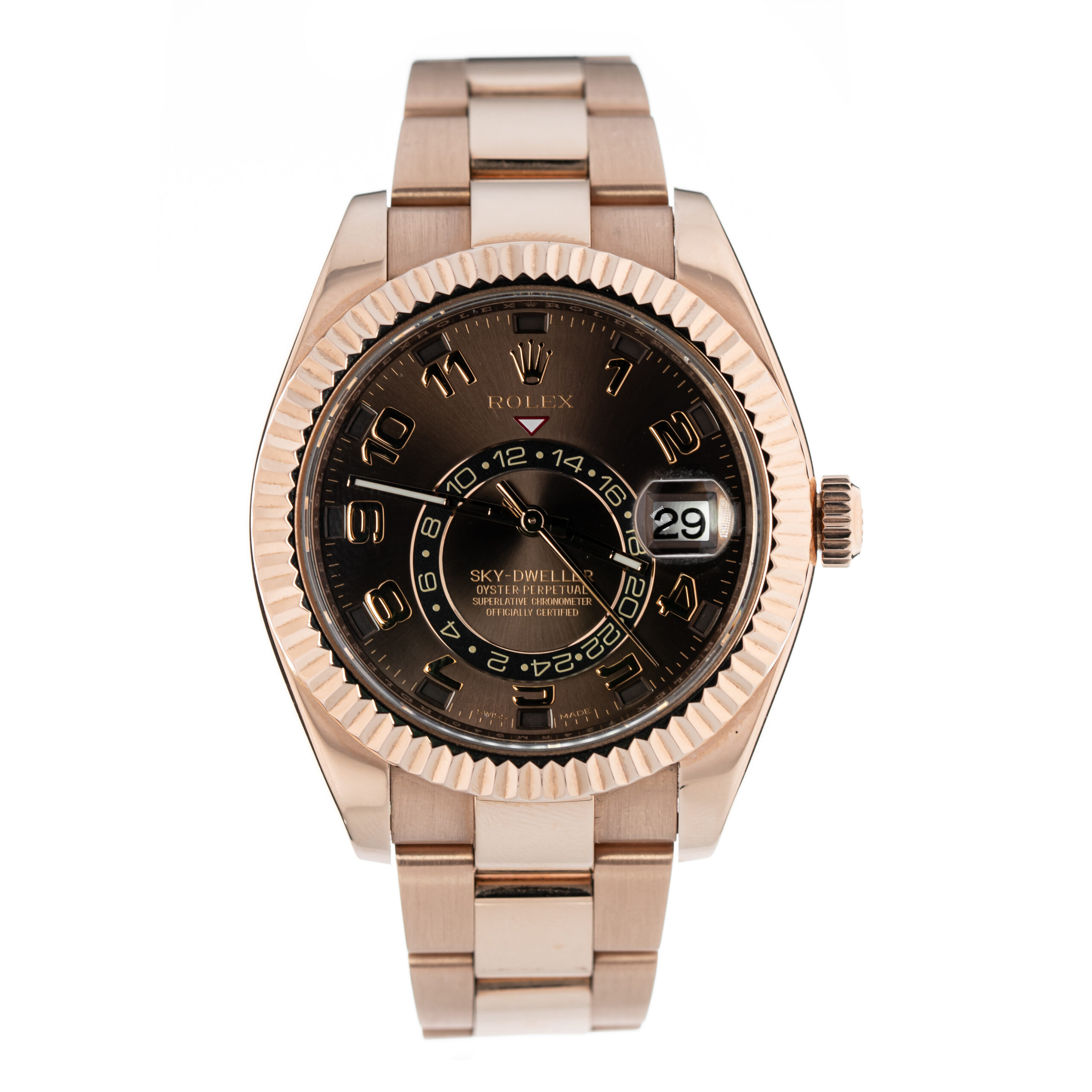 Rolex Sky-Dweller is designed in a 42mm 18k rose gold case with a chocolate dial and styled on an oyster bracelet. A unique Ring Command bezel sets the watch’s features, including a second-time zone and annual calendar capabilities. Luminous Arabic numeral hour markers and a fixed white triangle indicate the chosen reference time.
